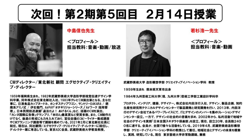 この日は、偶然にもこのお二人が来てくださることになりました。なんとたくさんのCMを作ってこられた中島信也先生とスギダラケのデザイナー若杉浩一先生!! お二人共に武蔵野美術大学の教授。贅沢な授業になります。