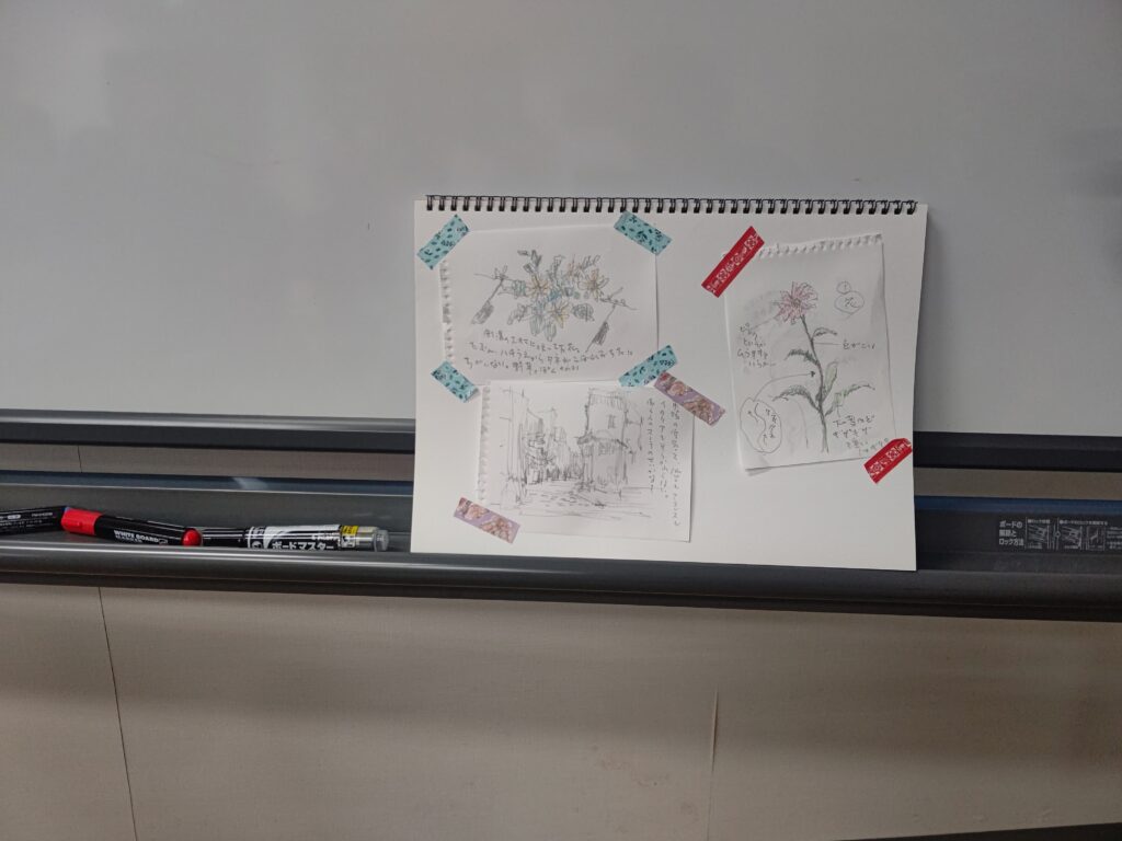 2時間目は、ちば銚子熱中小学校としての通常授業。仙台から古山拓先生においでいただき、旅好きの先生の、風景を切り取りその時の思いを残す方法を教えていただく。授業のタイトルは、「小さな旅とスケッチジャーナリングのススメ」